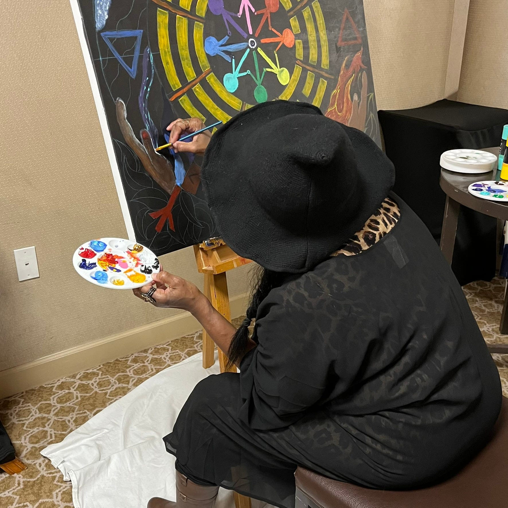 Throughout the conference, attendees were encouraged to add their energy to the magic by adding washable, acrylic paint to the canvas. Most had little to no experience with painting and were apprehensive at first, but after a few brushstrokes they began to gain confidence, if not skill. Others came by and added their energy without adding paint — and that was totally welcome!